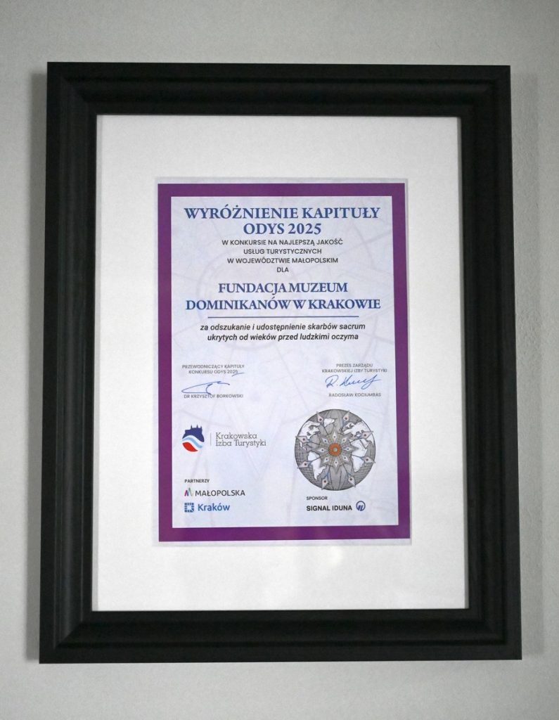 Miło nam poinformować, że 11 XII 2025 roku Muzeum Dominikanów w Krakowie zostało uhonorowane „Wyróżnieniem Kapituły ODYS 2025” w konkursie na najlepszą jakość usług turystycznych w województwie małopolskim.